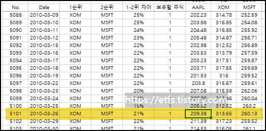 예를 들어 2010년 1분기말에 애플(AAPL), 엑손모빌(XOM), 마이크로스포트(MSFT) 시가총액을 보면 209B, 314B, 260B로 일전에 연도별 미국주식 시가총액 순위 포스팅했을때의 데이터와 유사하다.
