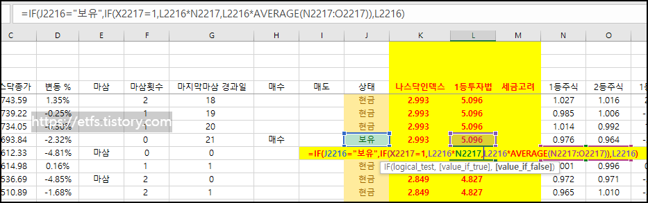 2등 주식 같이 50:50 가져가는 경우는 전날대비 오늘 종가기준 변동폭을 1등,2등 주식의 평균값으로 곱해준다.