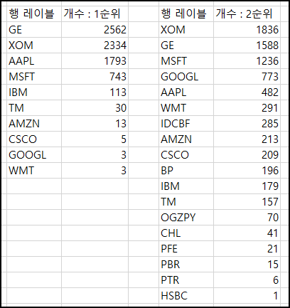 시가총액 데이터에서 1등한 날짜수, 2등한 날짜수를 집계해보면 이런 식인데