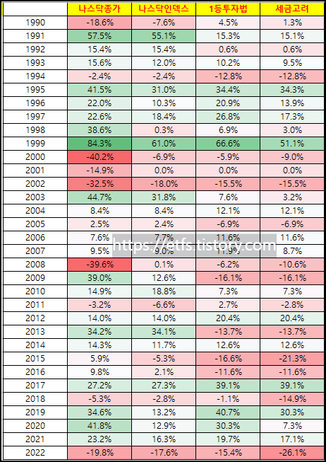 🔺 나스닥 지수를 각 연도별 연초(가로축)에 투자했을 경우 각 연도별 연말기준(세로축) 누적수익률