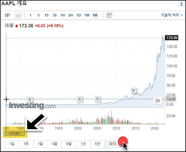 실제로 애플의 historical price 데이터를 조회해보면 1980년부터 나온다.